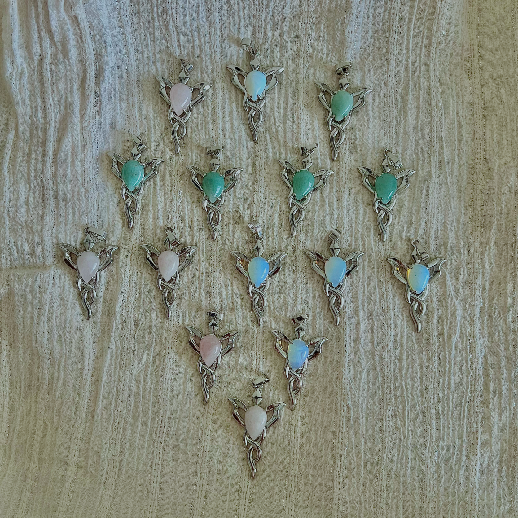 A dainty silver fairy pendant, cradling a glowing crystal at her heart.