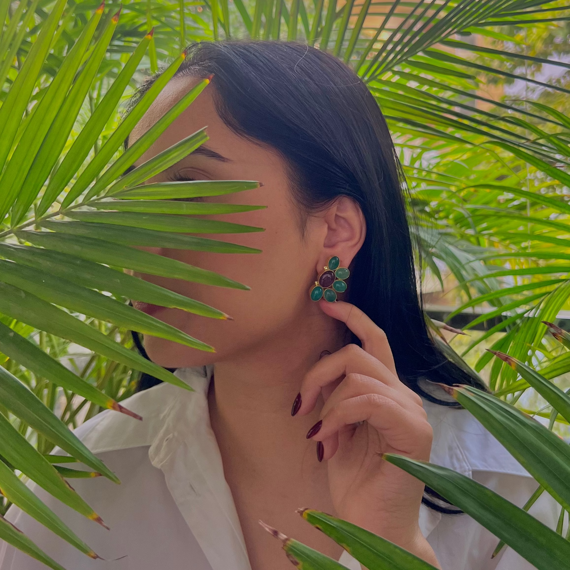 Elegant and timeless — the Jugni Earrings pair refreshing Green Chalcedony with rich Amethyst, set in 18k gold plating to create a graceful harmony of colour and light.