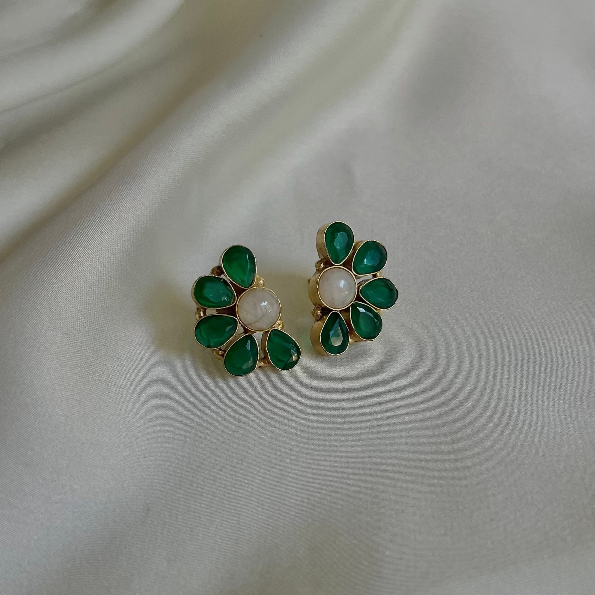 Regal yet rooted — the Jugni Earrings pair soothing Green Chalcedony with a moonlit Moonstone centre, handcrafted in 18k gold plating for a timeless statement.