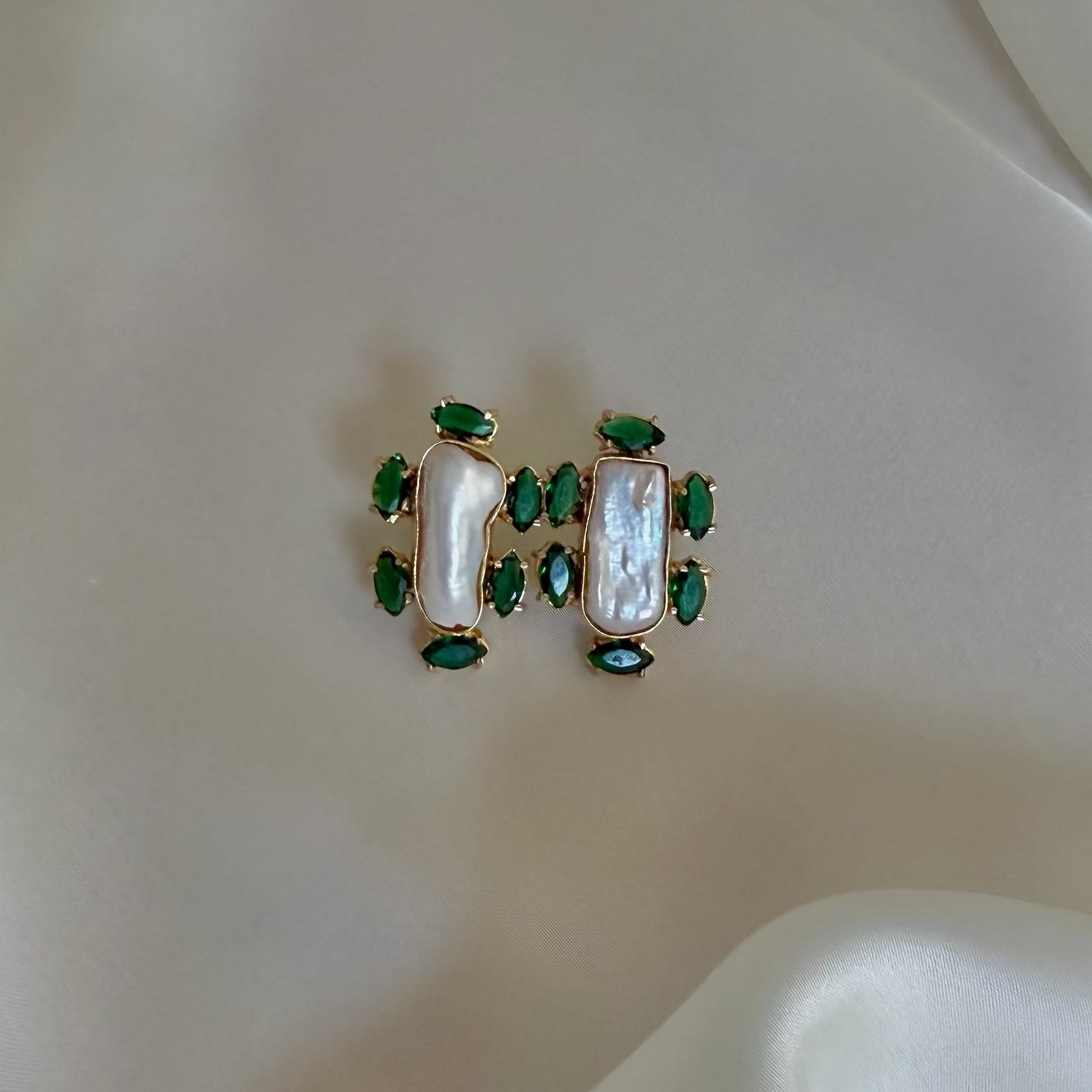 Material: 18k gold-plated brass with Baroque Pearl and Green Chalcedony.
